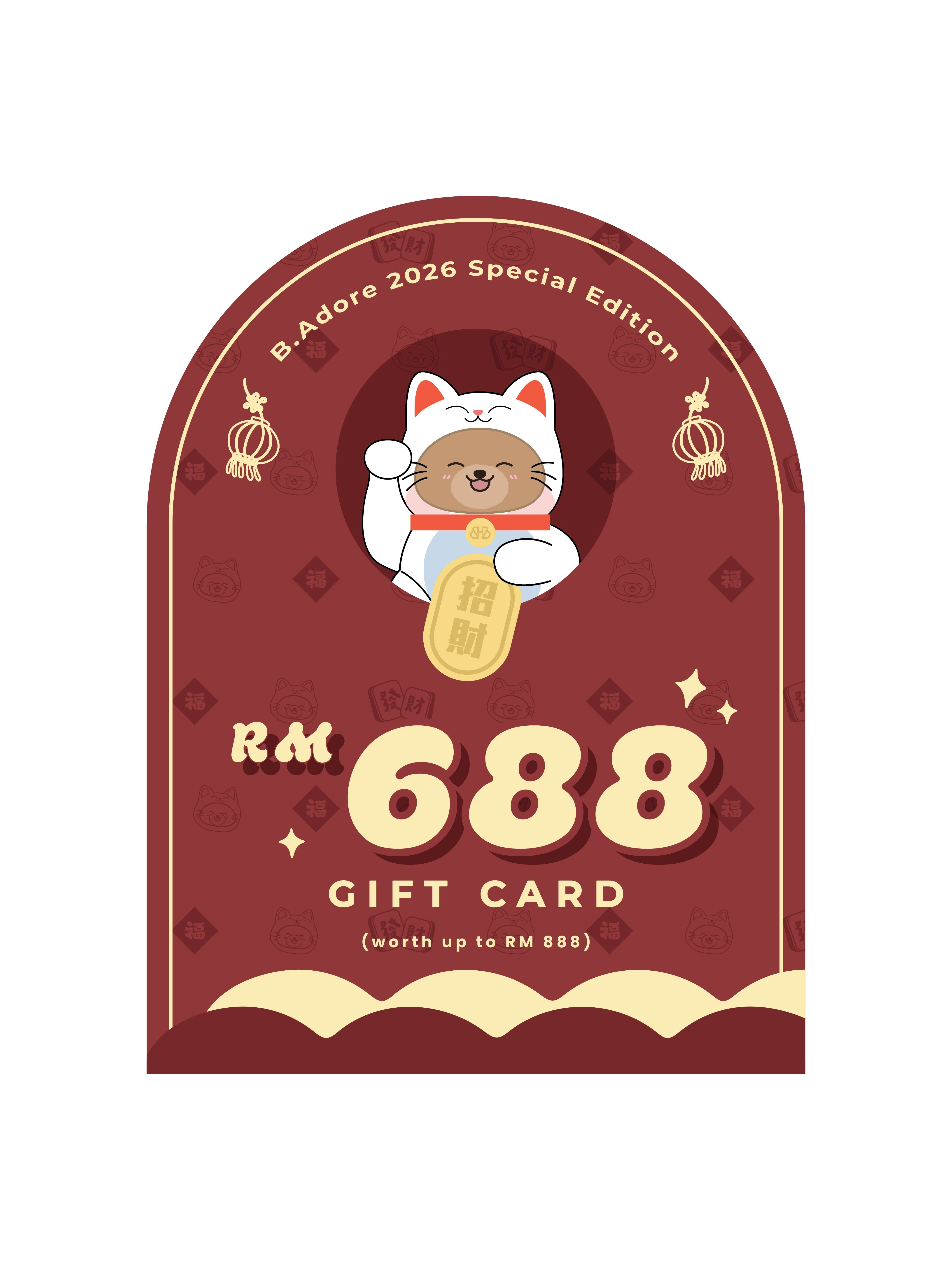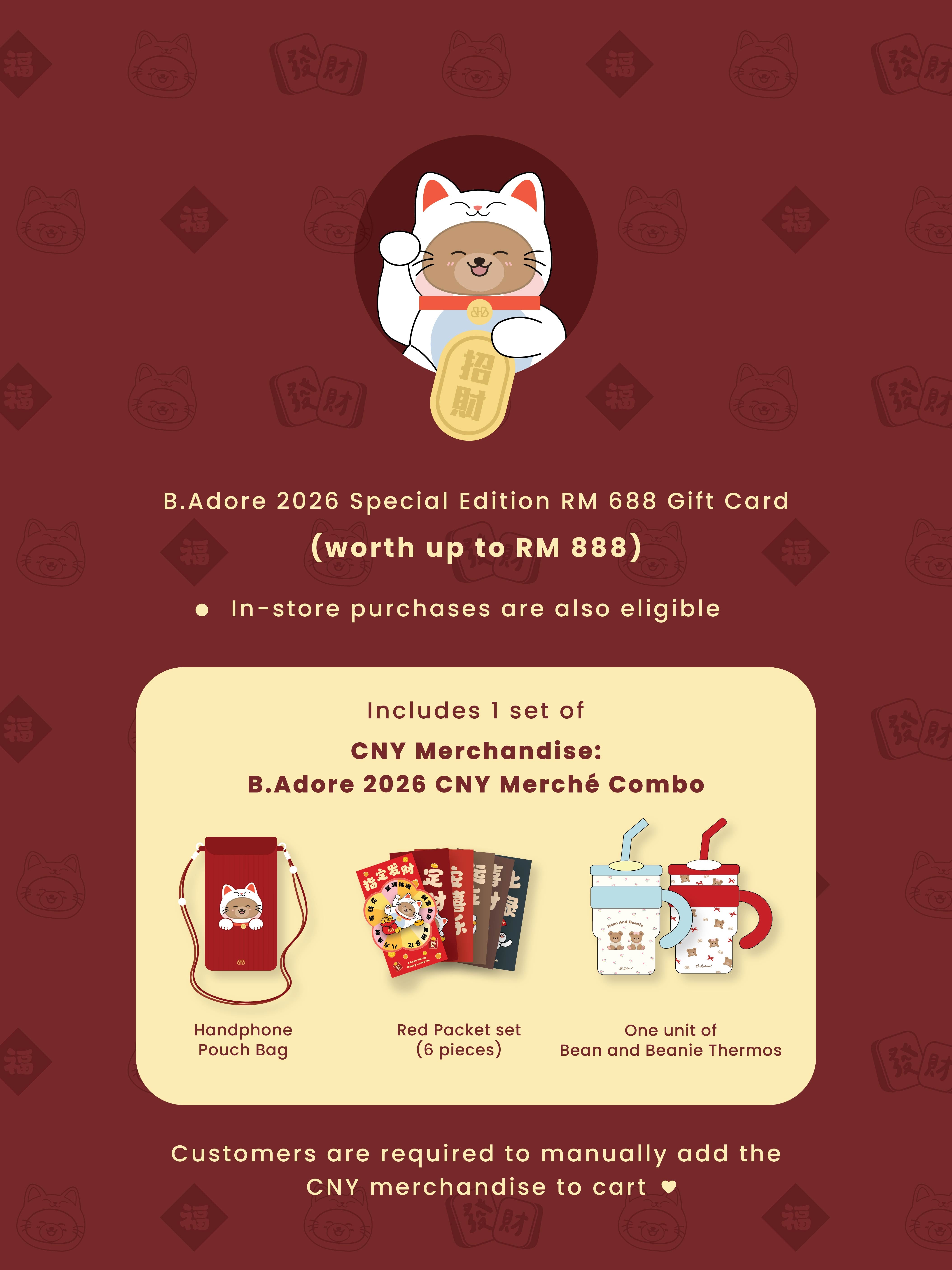 - Gift card include: RM688 Gift card credit and FREE 1 set of B.Adore CNY 2026 CNY Merché Combo. Worth up to RM888