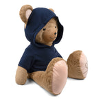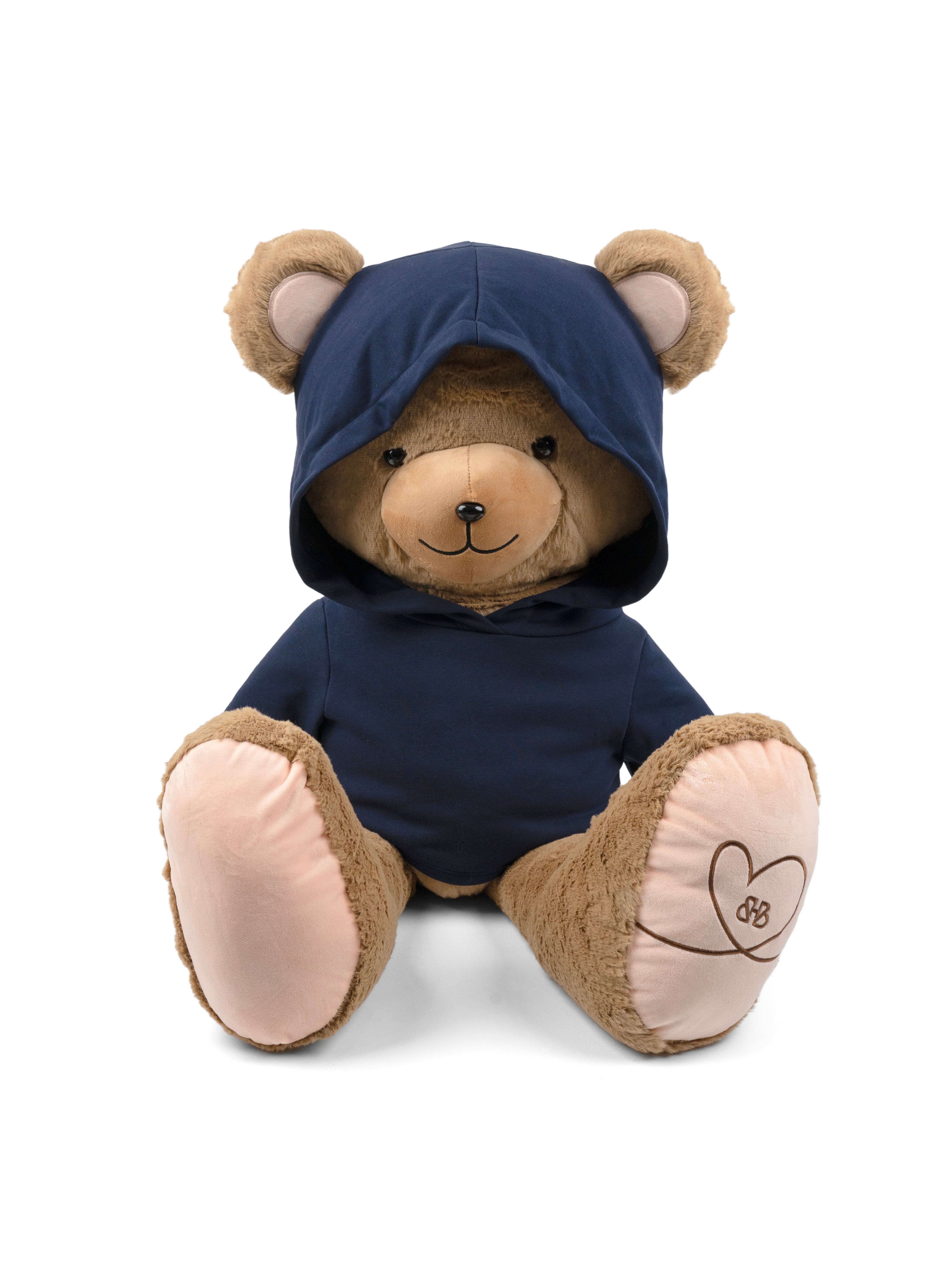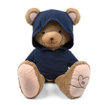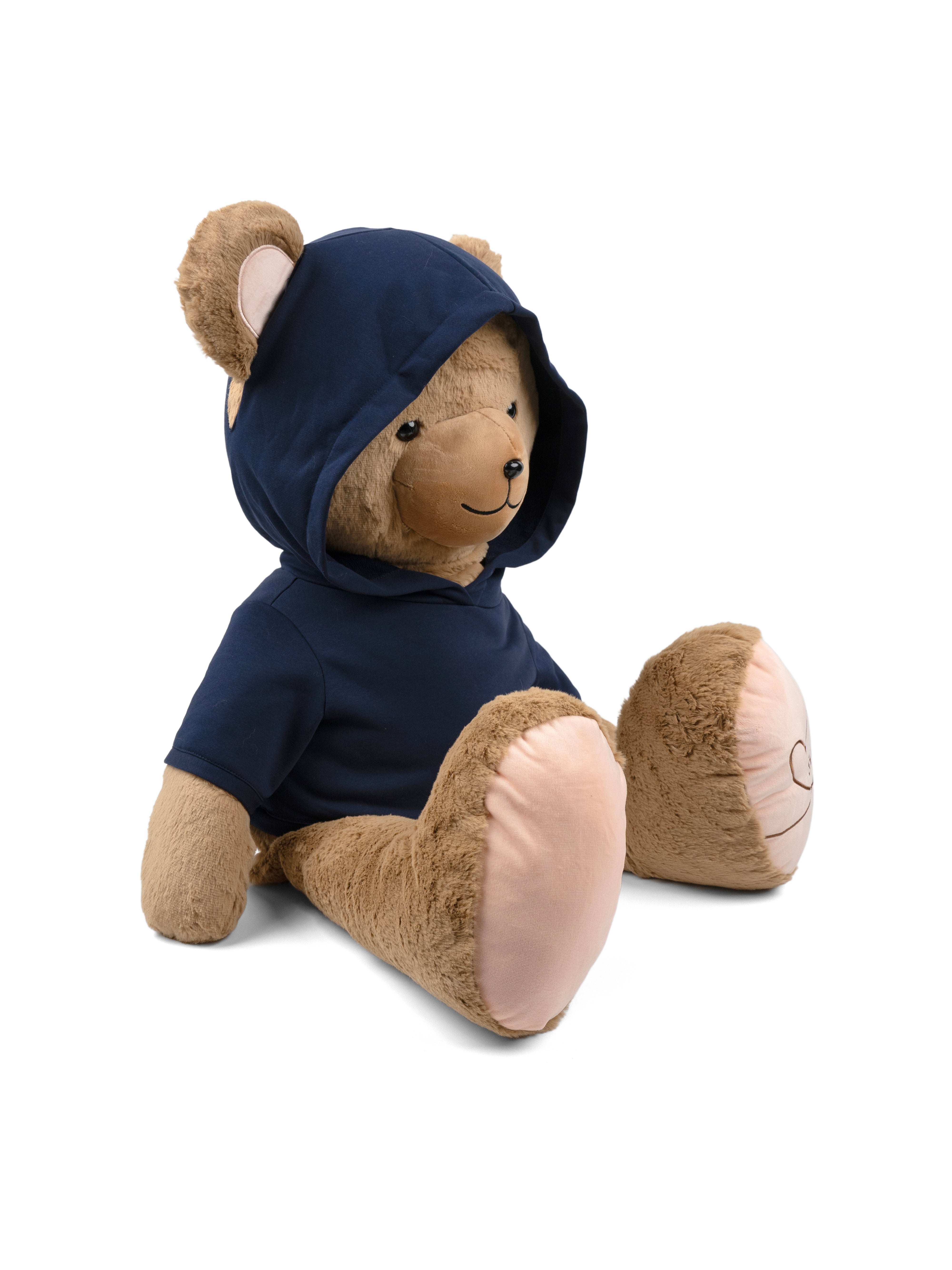 - The wording is embroidered in beige on the front of the plush toy's hoodie.