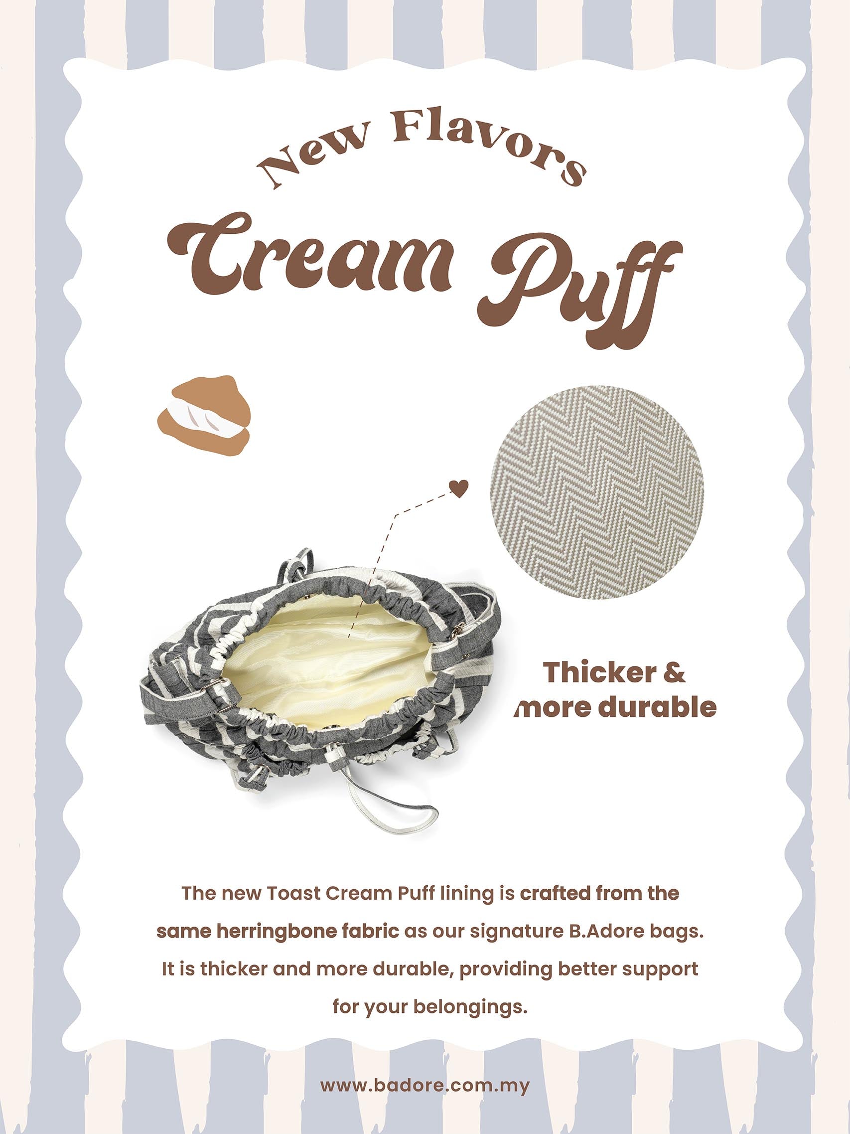 Remark: The new Toast Cream Puff lining is crafted from the same herringbone fabric as our signature B.Adore bags. It is thicker and more durable, providing better support for your belongings.