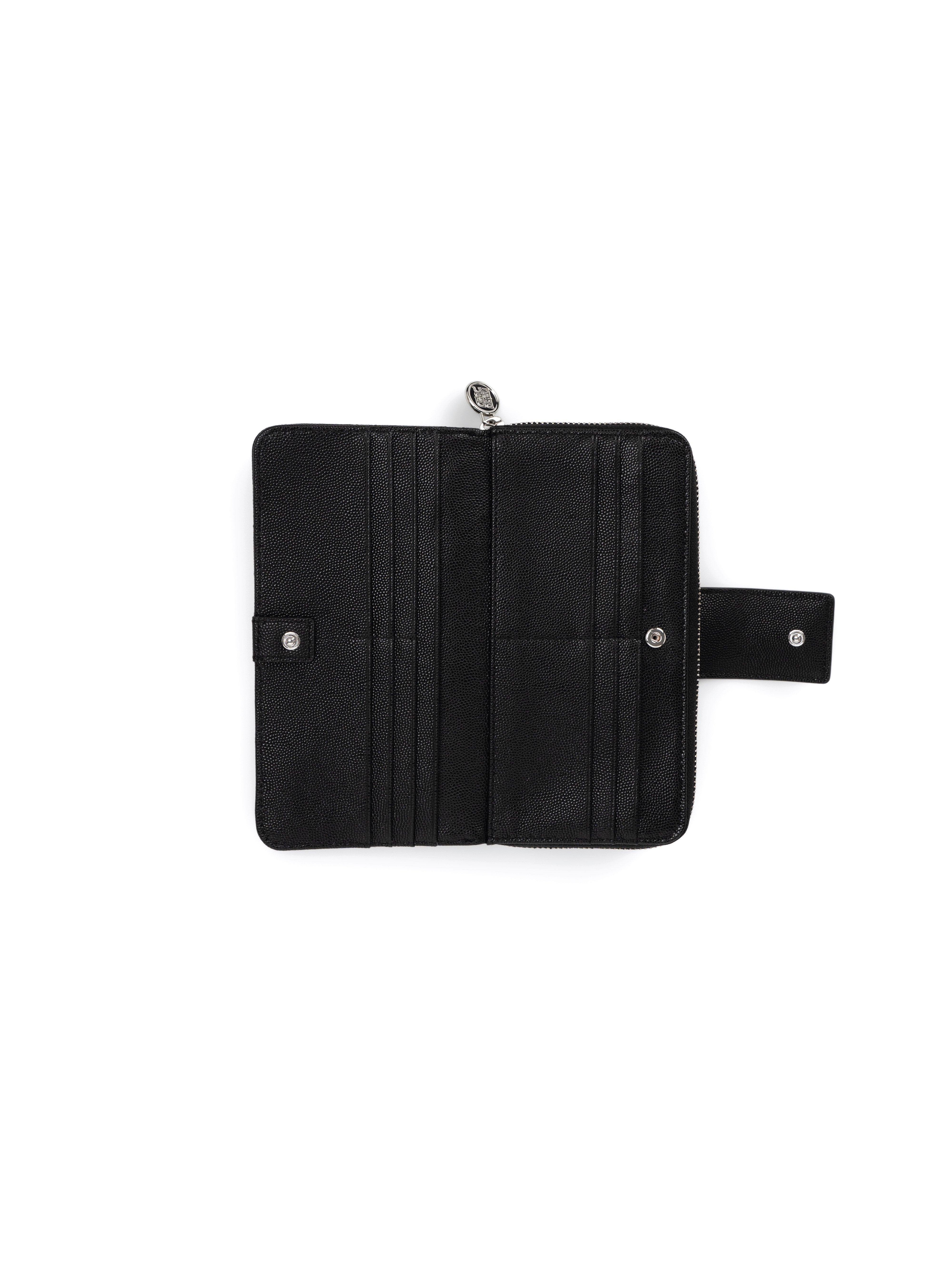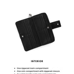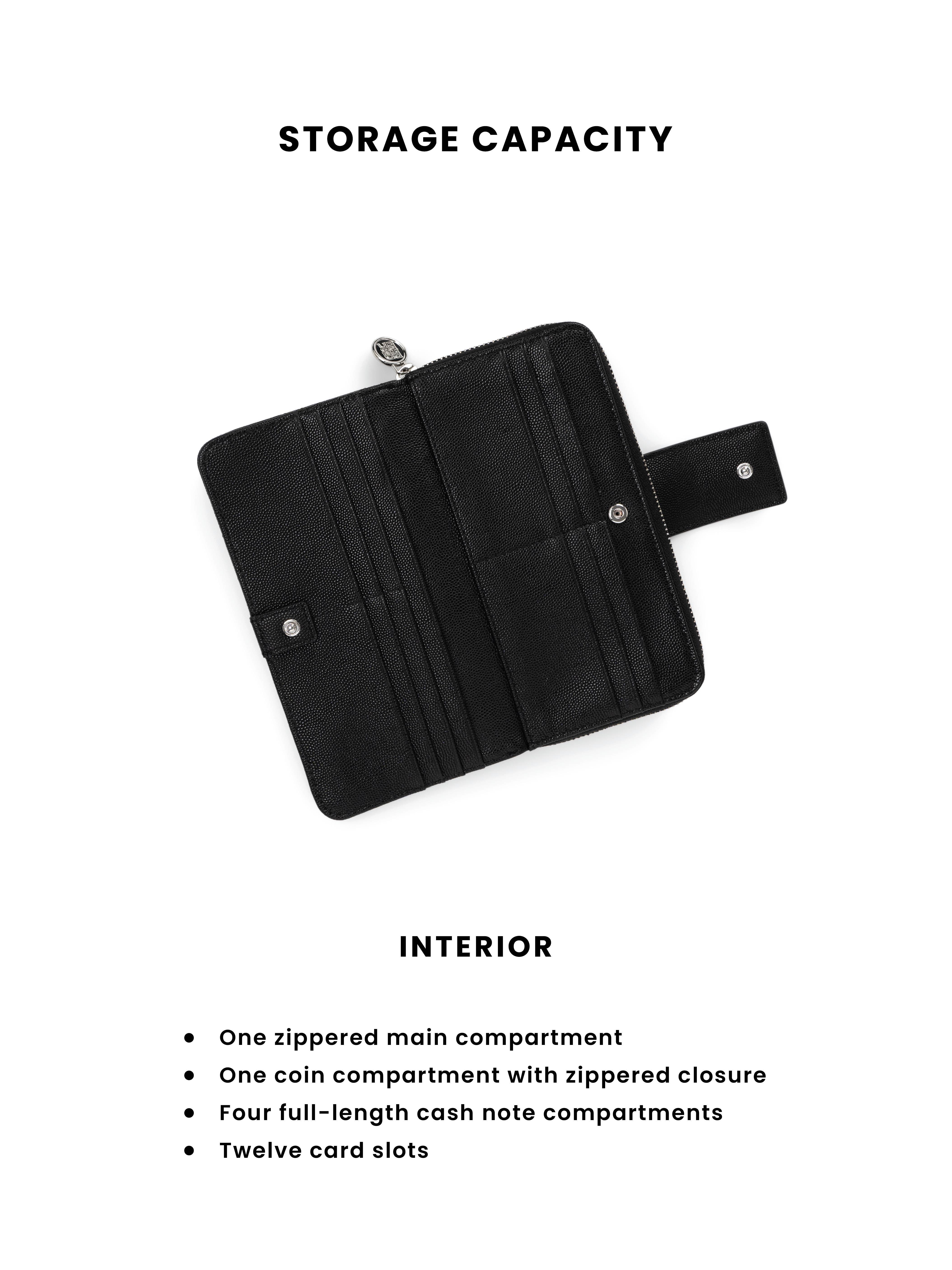 | Inner Compartment | -One zippered main compartment -One coin compartment with zippered closure -Four full-length cash note compartments -Twelve card slots |